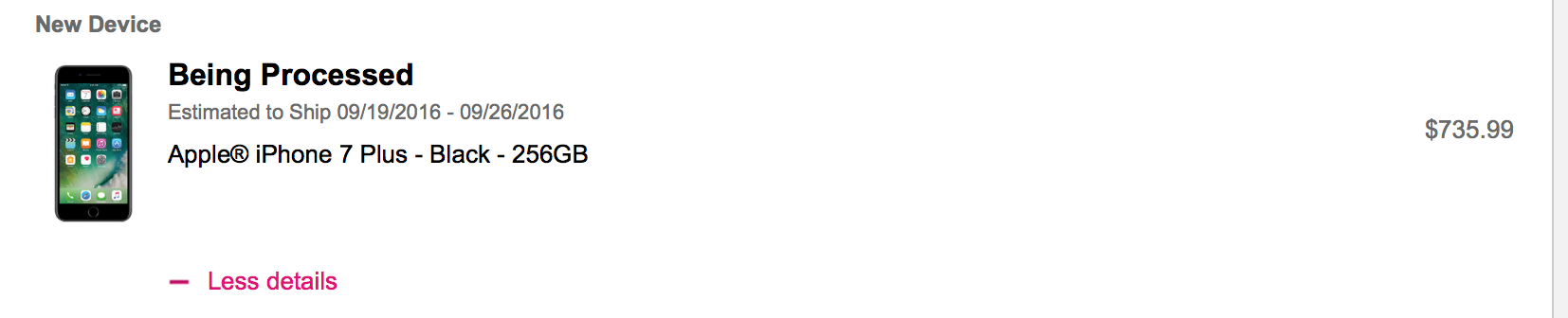 iPhone 7+ 256gb, black, JOD ordered 0100 MST. Ship 9/19-9/26. Shipping updated to UPS expedited next day. No CC charge yet. Processing...