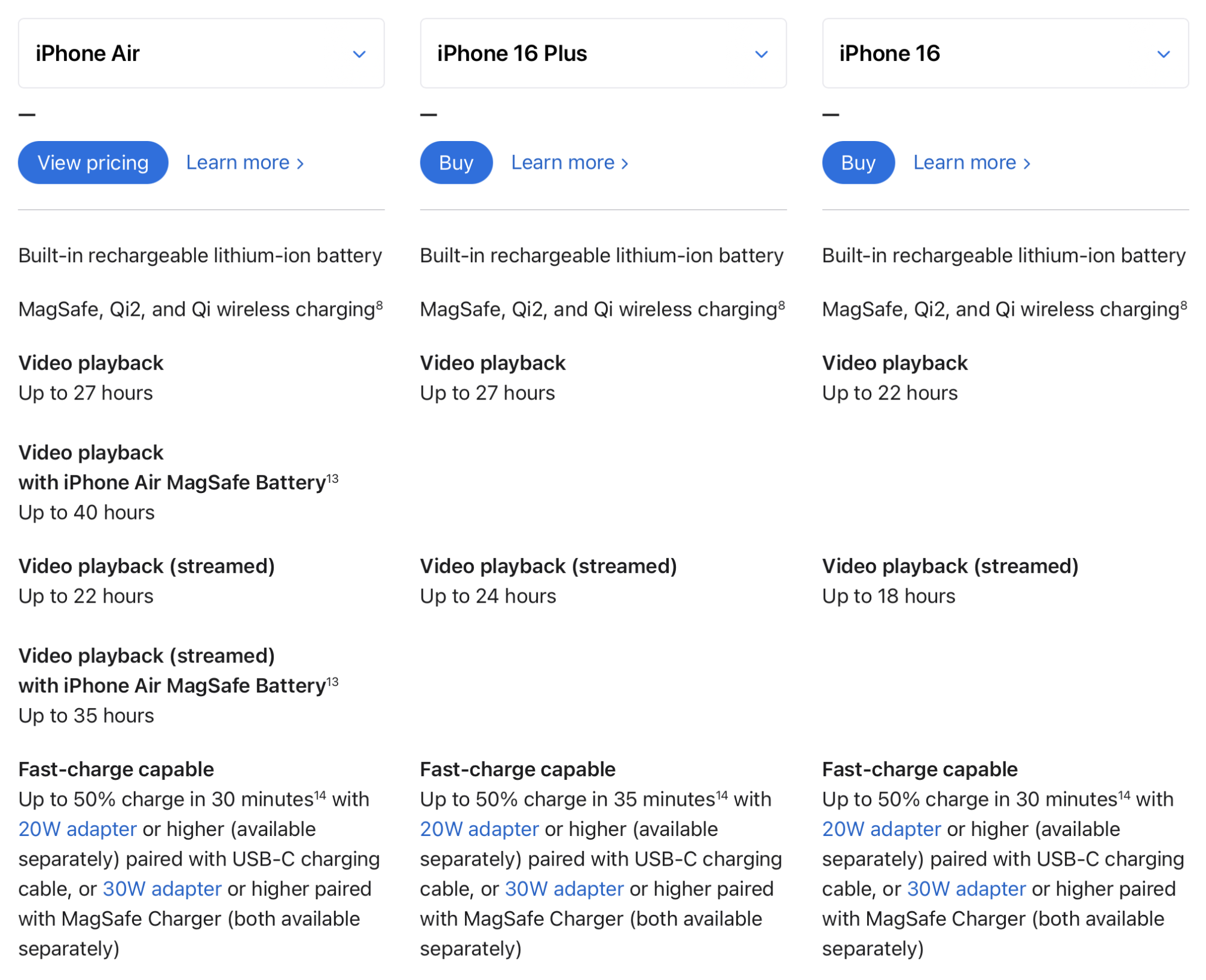 I was 90% sold on the Air before it was even announced just because I don't need Pro-level power or cameras and wanted the thinnest and lightest phone possible. However, rumors about the battery life were giving me pause. That pause vanished once I checked out the battery comparisons on Apple's website, which went live just now.
