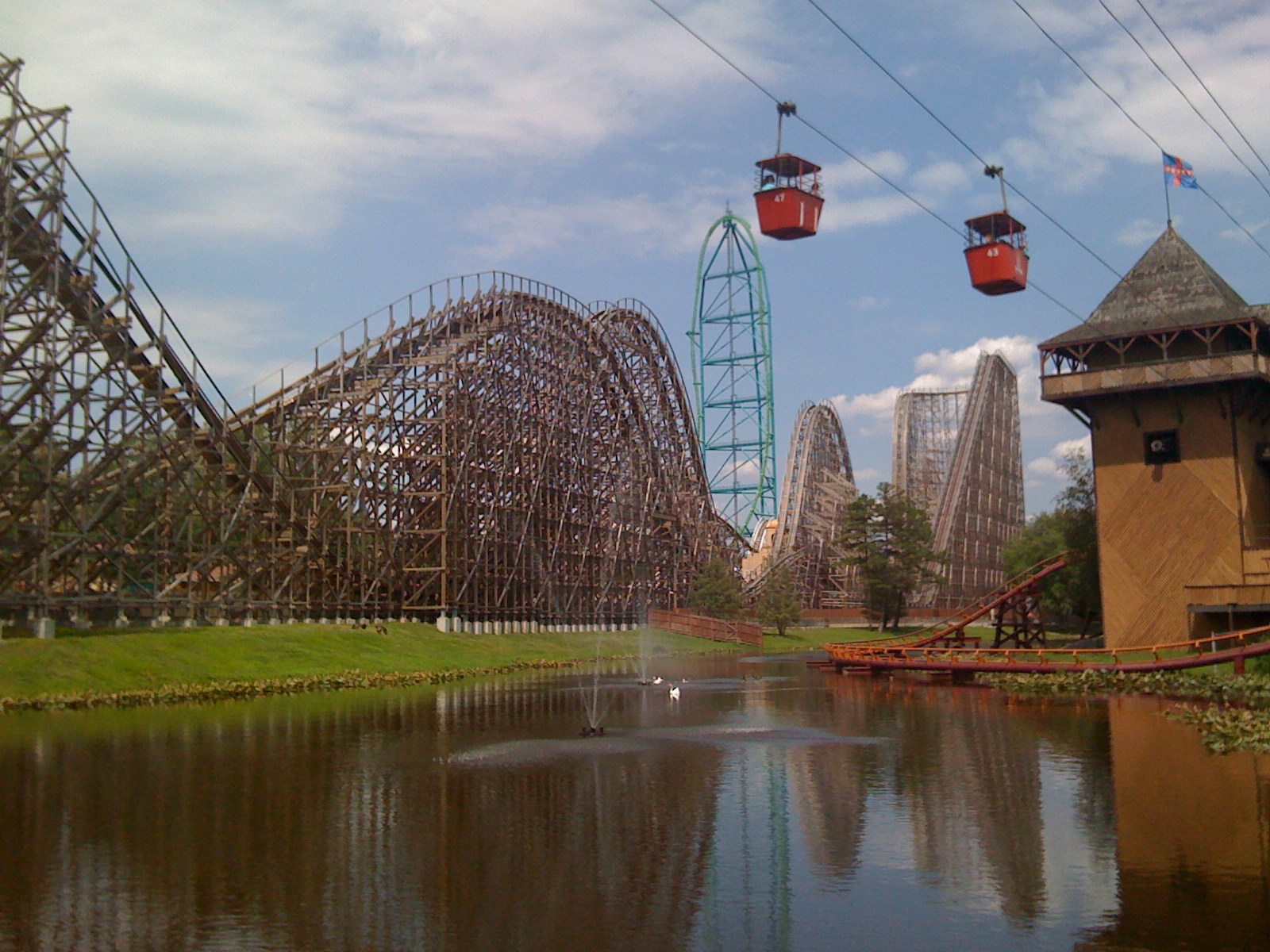 That pictures reminds me of Cedar Point in Sandusky, Ohio.... their monster wooden coaster, and the Top Thrill Dragster ride in the background