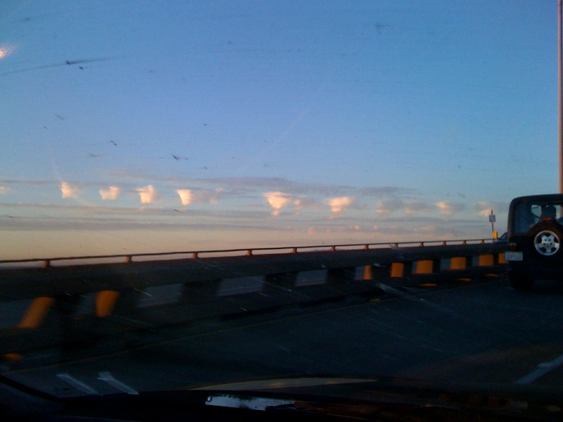 Riding home with my carpool last night, we saw these strange clouds. They were very regularly-spaced and formed a line across most of the sky. Some seemed like exact clones of each other.