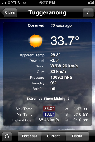 Ha! Today in Canberra it was 35 degrees Celsius (95 degrees Fahrenheit). Right now at 6:30 PM it's still 33.7 degrees and the humidity's only 9%!
