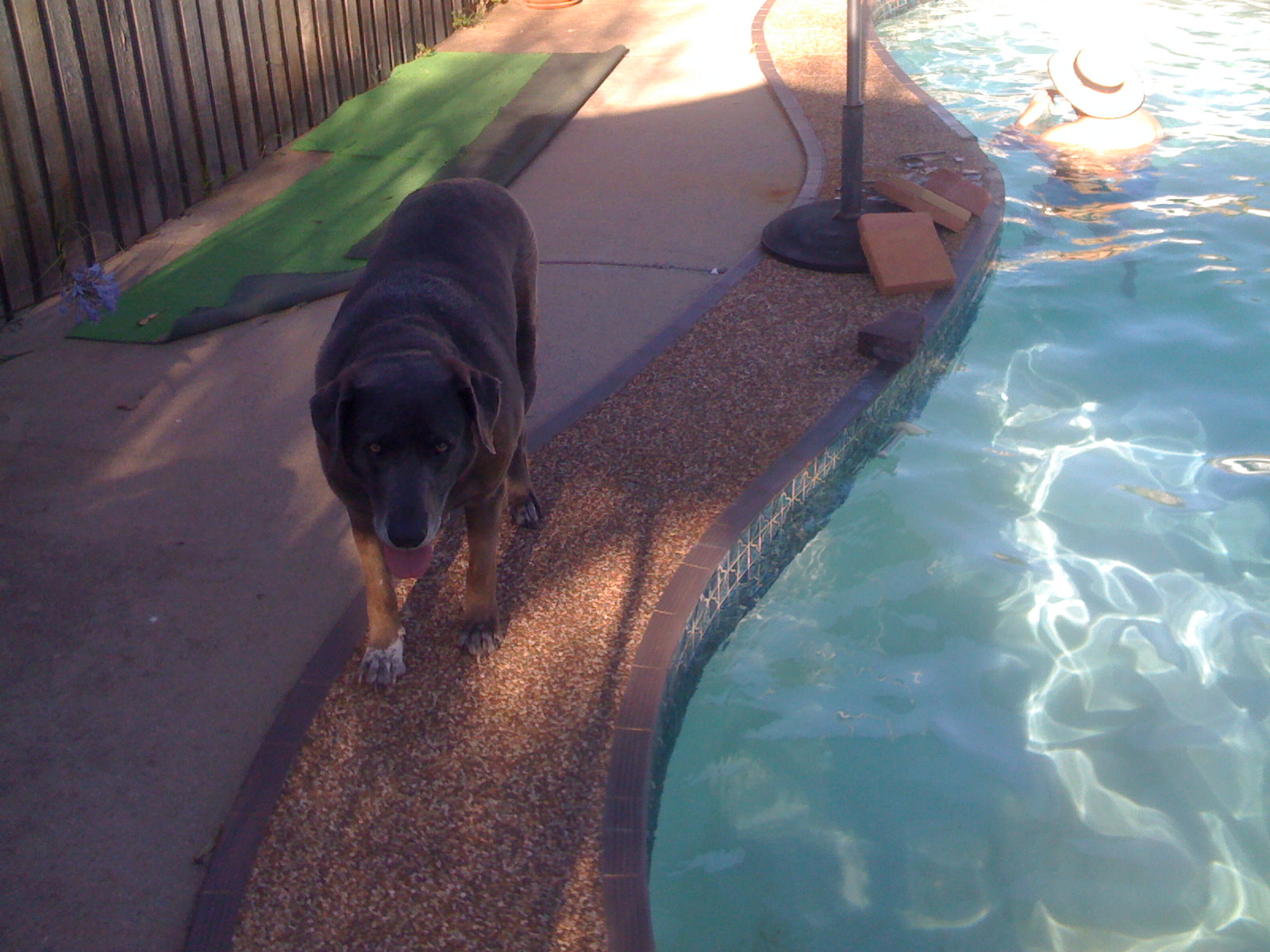 1. Temperature outside | 2. Current weather/surroundings | 3. Pool thermometer | 4. The dog at the pool