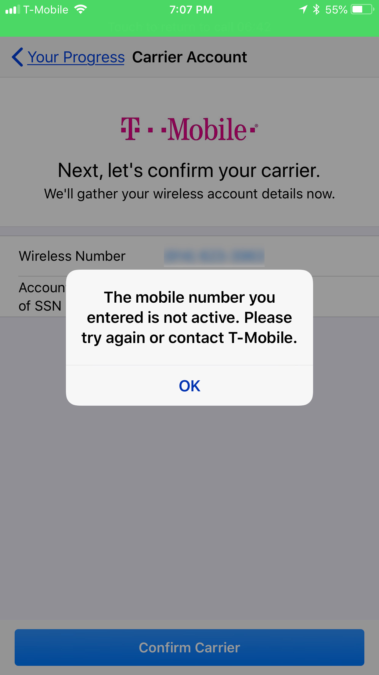 I'm entering my correct pin and number for my t-mobile.
