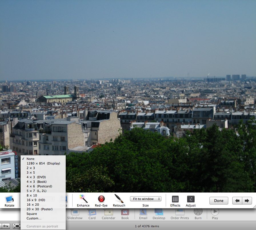 The other option is the constrain menu that should be directly left of the crop button. It has a bunch of preset ratios but also has a custom option. I attached a screenshot of this menu open in my iPhoto (version 6).