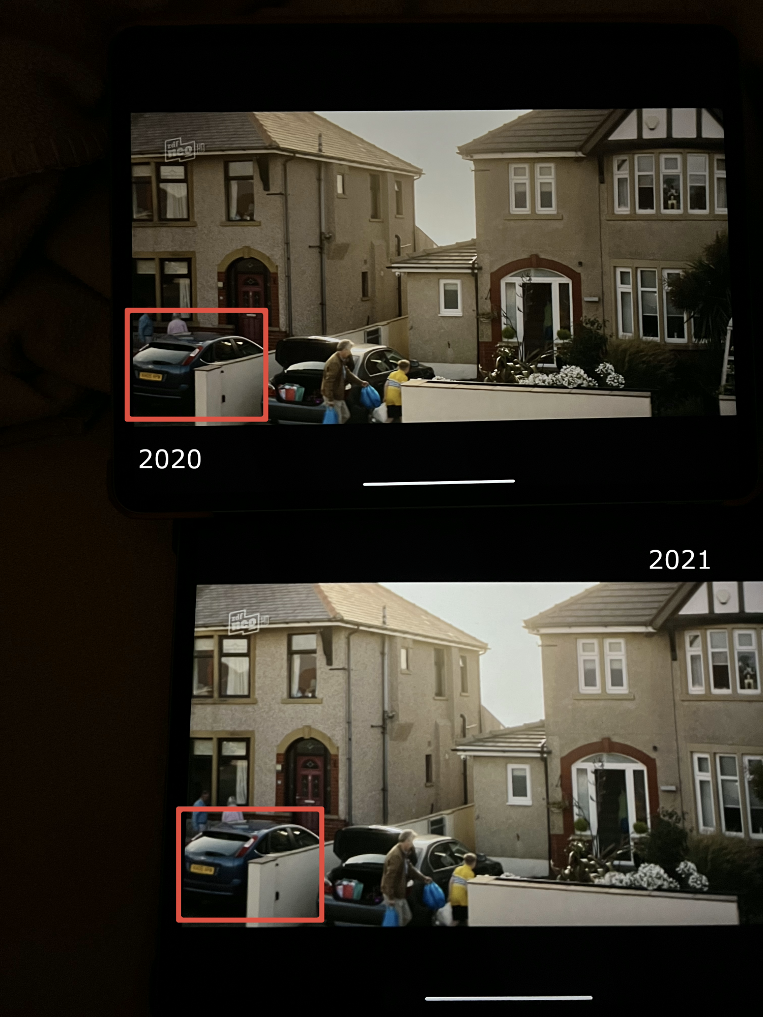 I have attached two pictures for comparing the iPads, marking the areas where the problem was striking to my eyes (pay special attention to the number plate on the car and the ship's name). For good measure I also made a comparison that demonstrates the blooming effect (here visible in two stages).