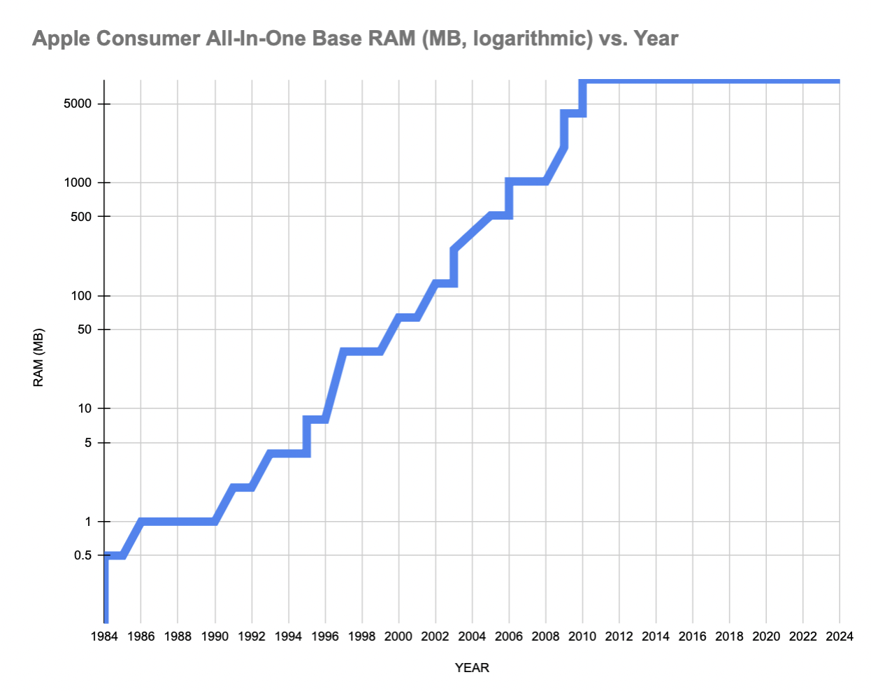 The last decade is a neat data range, given the base SKU Macs RAM since the Mac 128K about 40 years ago: