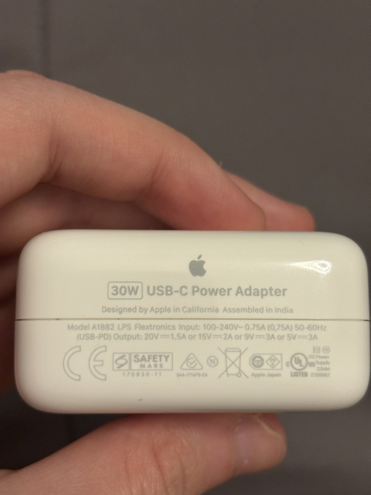 So while I cannot guarantee it's a genuine charger, the imprint 'Flextronics LPS' definitely is not suspicious in any way.
