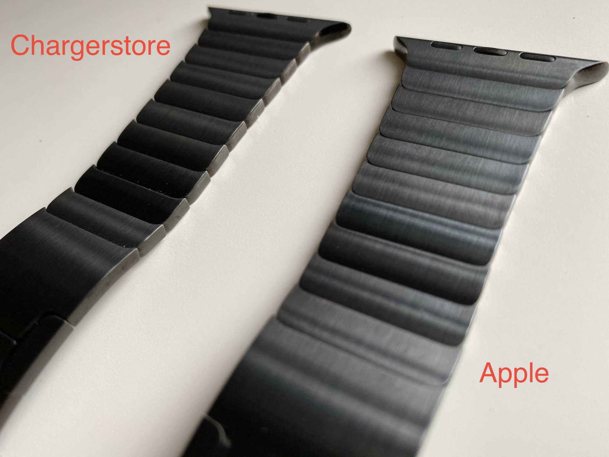 So I decided to try the genuine Apple link since the finish on my band from Chargerstore has been wearing off so quickly from nothing more than occasional contact with a desk or table. My Apple band arrived a few days ago and I figured I would share my observations for anyone interested since I have been able to compare the two bands side by side.