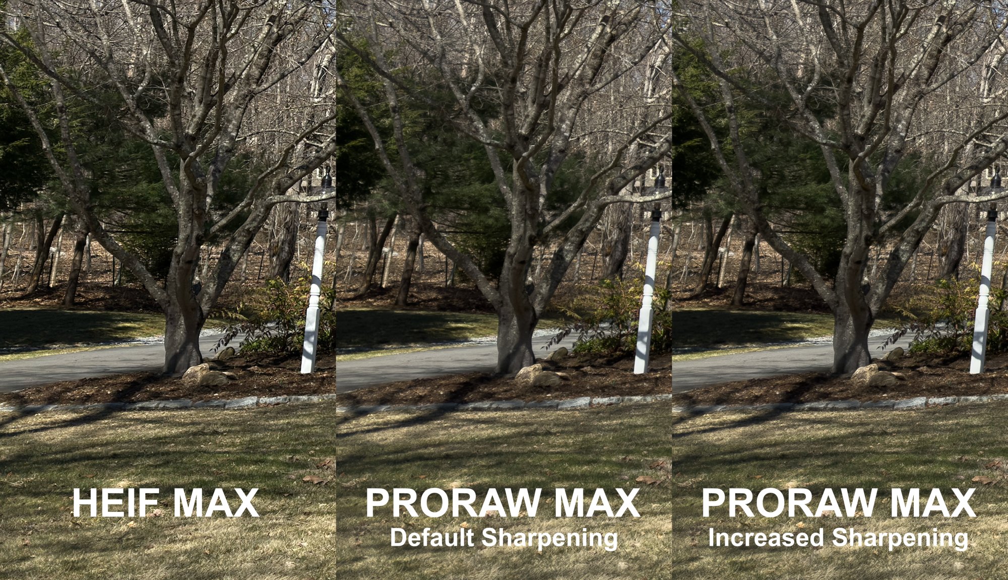 The HEIF MAX was left unedited and converted to JPEG directly from the Photos app. The ProRAW DNG's were imported into Lightroom and all default settings (Apple ProRAW profile, etc.) were left untouched except for sharpening. The first ProRAW photo had sharpening left at the default amount of 50. The second ProRAW photo had sharpening amount increased to 80. They were both then exported as JPEG's.