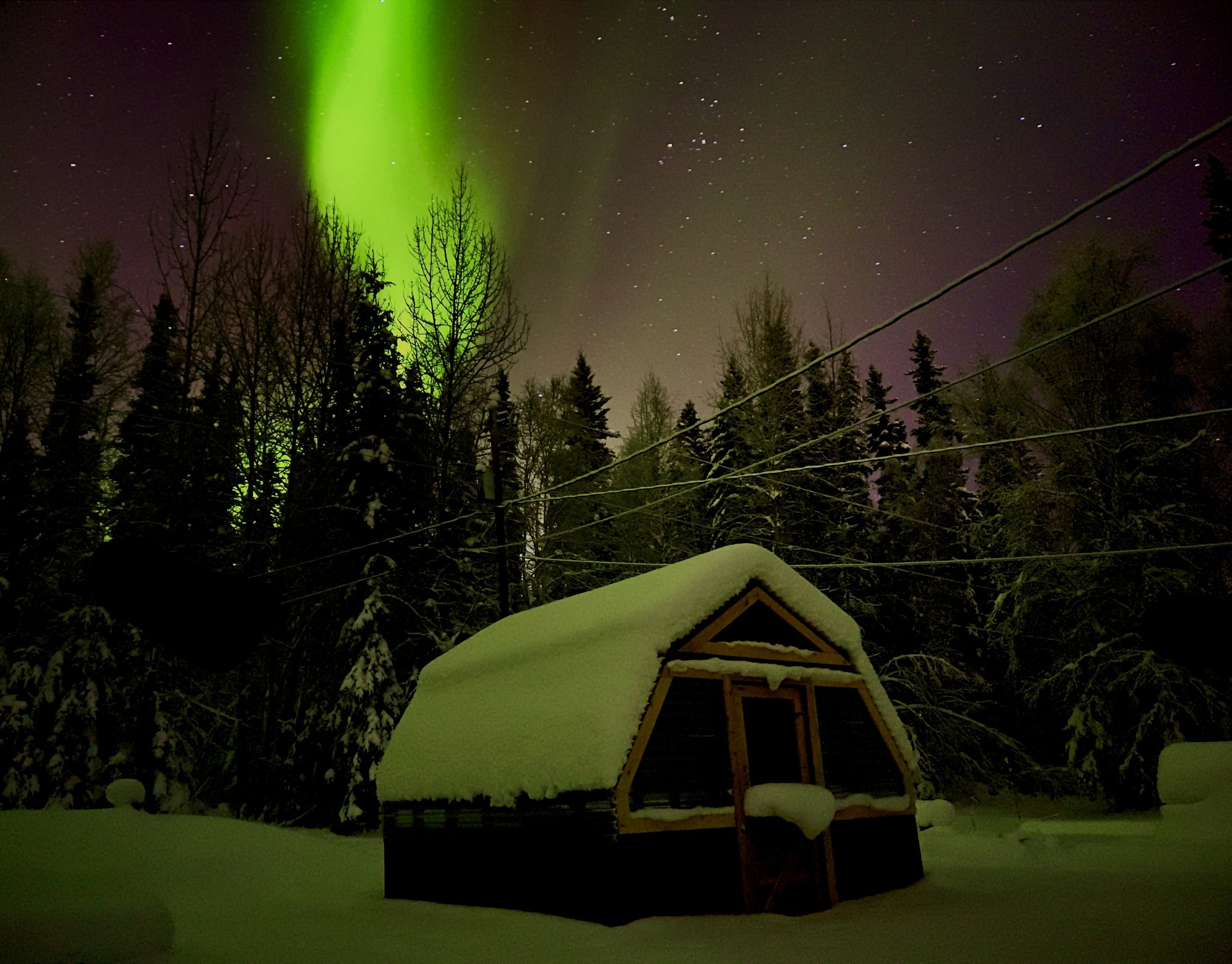 This photo was outside my house here in North Pole, AK. The Northern Lights were popping nicely!