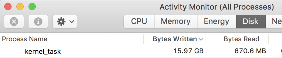 I've recently realized that the kernel_task process (I don't know what it is) is having huge numbers in disk usage, over 10 gigs of bytes written!