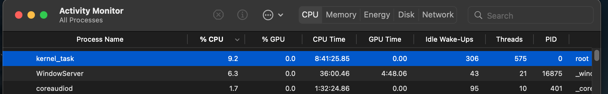 Have been using my new M1Pro 14'' (base model) for a week or so now and besides the memory leak issue (which I also have) I saw that kernel_task uses 575 threads and is quite often at the top of CPU consumption (in the screenshot the mac is pretty much idle with a few programs open in the background, temperature is about 48-50 Celcius / 117-120 Fahrenheit on the cores). I compared this to my M1 Air, also on Monterrey, that does not have this issue, although it seems like the Air did not report "kernel_task" in the activity monitor at all.
