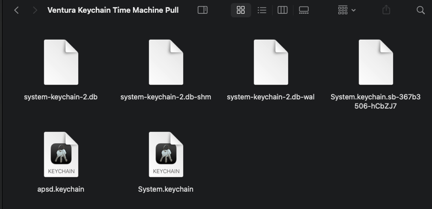 I used Time Machine & brought back (some of the keys) for example right now on my computer I have login.keychain & metadata keychain. but on the keys that I pulled from the Time Machine are called. System.keychain & apsd.keychain. some of the files are the same like system-keychain-2.db-wal.