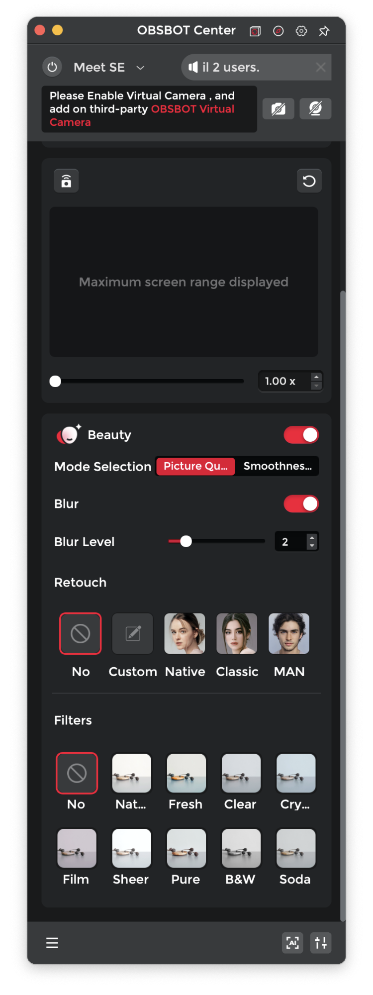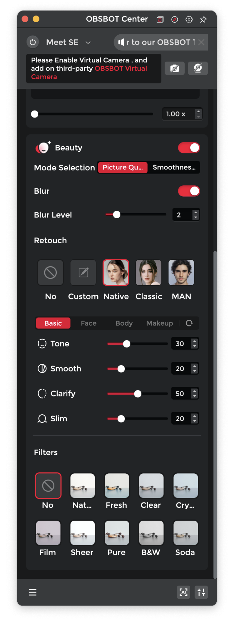 The Alogic lightbar/webcam just seemed super close-up, disturbingly so! There was no option to zoom out and the quality was way below 4K. The Obsbot is much better. There's an 'OBSBOT Center' app that lets you adjust a whole host of settings and image parameters, most of which I don't use – see screen shots. There's a bunch of AI stuff if you feel the need to make yourself look more beautiful!Speaking of webcams