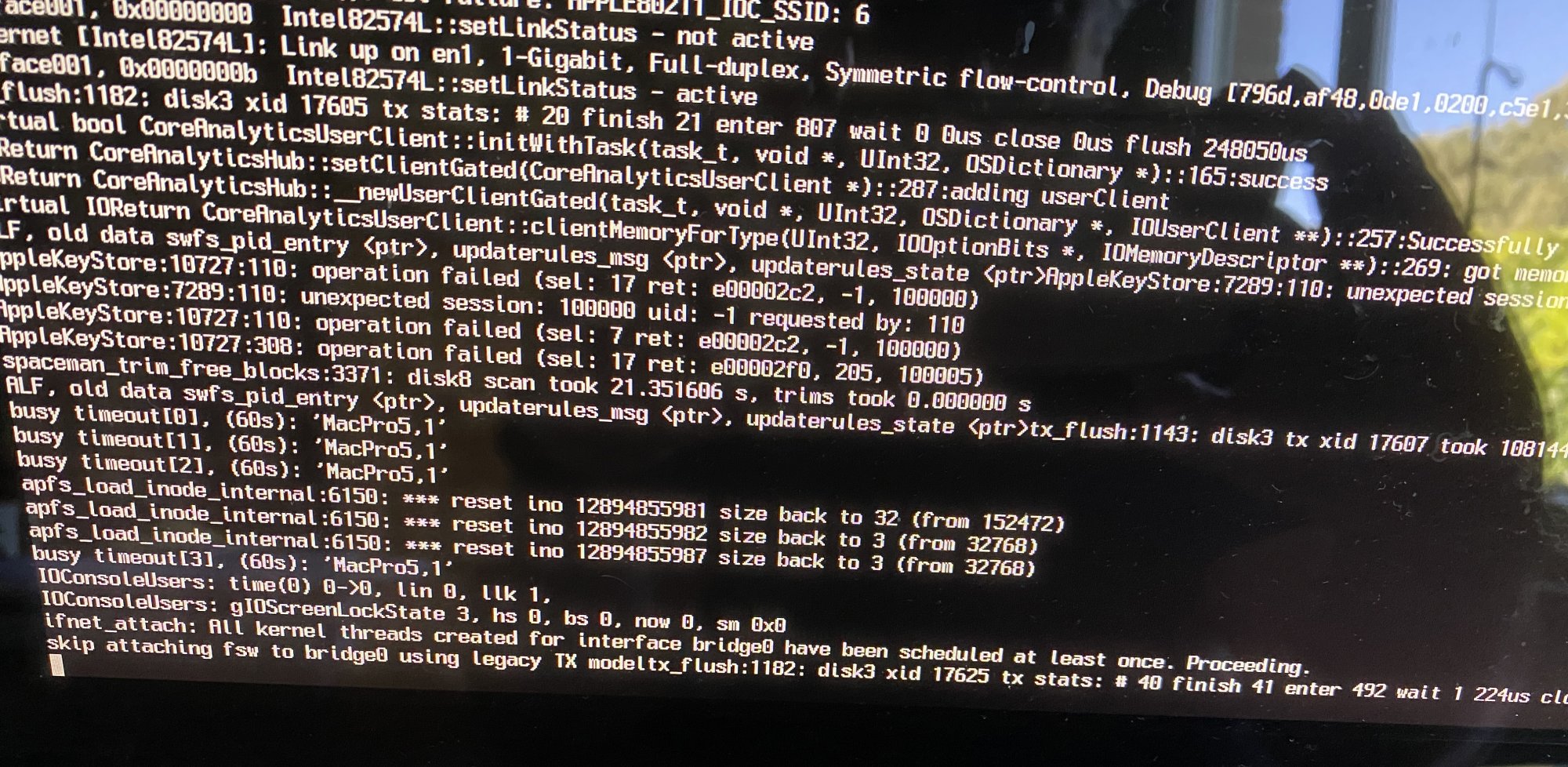 Perhaps my Mac Pro 5,1 is not the best testing ground for latebloom. Before latebloom, I only got my Mac to boot one time out of roughly 30! It doesn't have any NVMe blades or SSD disks, just four regular hard disk drives (one of them moderately fast, at 7200 rpm). It also has a Titan-Ridge Thunderbolt 3 PCI card and an updated Wi-Fi/Bluetooth module. It has a 6-core X5765 processor running at 3.07 GHz.