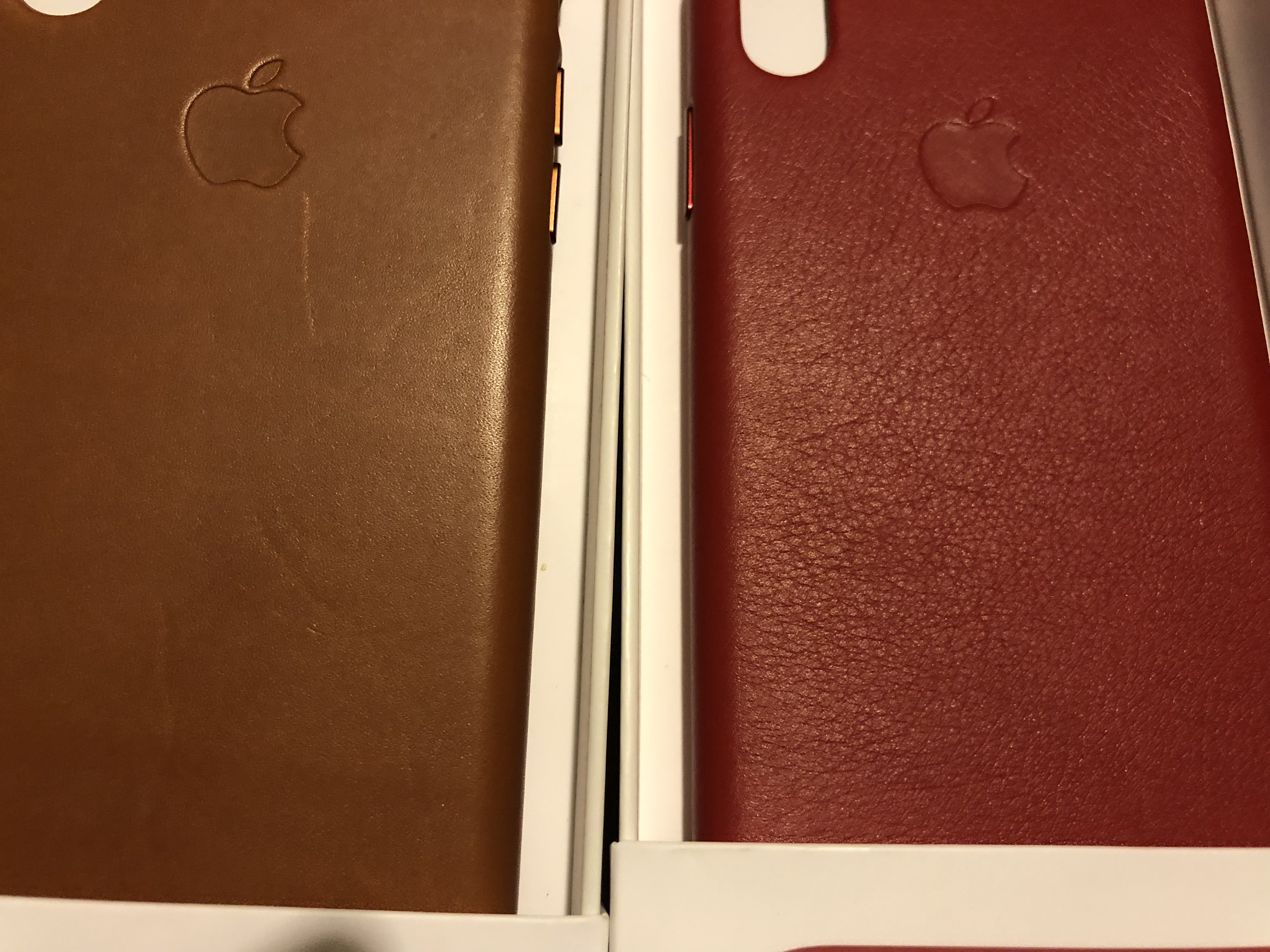 Hard to tell from a misaligned picture but I have had leather cases from the Apple store that look like both of those. If you wanted authentic, you should have just bought from the Apple store. Either which way, leather come from a formerly alive animal so the leather types will vary from case to case.All post so can see what I mean by the feel different. You can kind of see it. But I actually didn’t buy from Apple store.