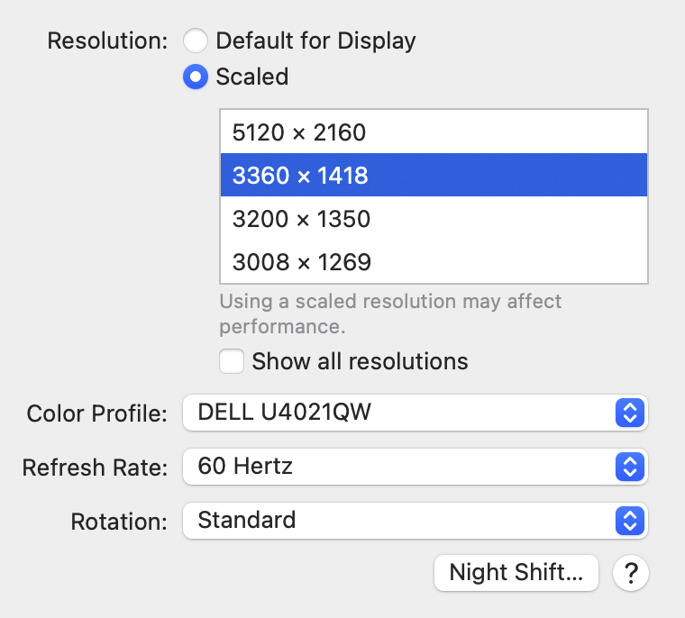 What the heck??? I have an M1 MacBook Air and have never gotten that resolution option even when option clicking Scaled and Show all resolutions. I have to run it at native res and squint to read anything because the only other option makes it look like a Playskool toy.3840x1620 is working here natively (no extra software installed.) Macbook Pro 16 (2021) with M1 Pro, connected to LG 34WK95U via Thunderbolt. As others have mentioned, if the list with different resolutions are not showing, you have to option click the "Scaled" button. See pictures.