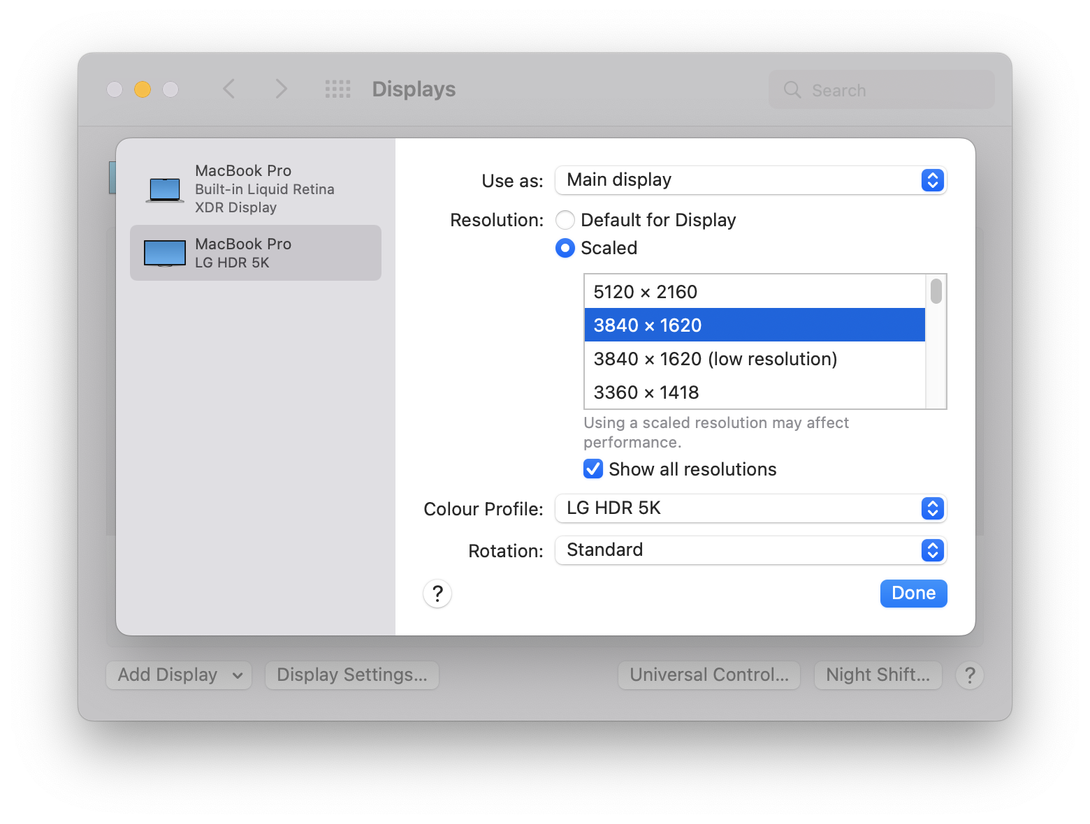 That's right, there is currently no option in macOS 12.3.1 to select a 3840x1620 resolution for this monitor. Only the following options can be selected from the resolution list:Just asking all here... as new Macbook Pro is coming Tuesday and i am interested in this LG 5120x2160 desktop monitor... to get rid of my annoying 2 monitor setup.