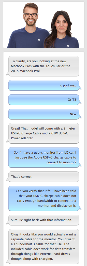 No sure wasn't and no one at Apple, LG, or Micro Center suggested this was the problem. You would think Apple would have released that information sooner than 11 days ago. They are still telling people that Cinema Displays with mini display port connectors can be used on the new MBP via T3-T2 connector. Which it can't. And, as I just found out as I am writing this, Apple is still telling people their charge cable can connect to monitors for display purposes.