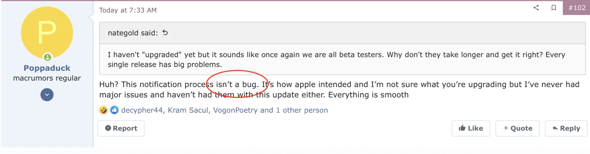 Maybe it was in another post you didn't quote, but this person didn't say it was a "bug", they said it was a problem. In my opinion, that problem is that the user experience is now hindered. It may not be a bug in that it was not unintentional, but it's still stupid. It may be smooth and functioning as intended, but that doesn't make it good.Huh? This notification process isn’t a bug. It’s how apple intended and I’m not sure what you’re upgrading but I’ve never had major issues and haven’t had them with this update either. Everything is smooth