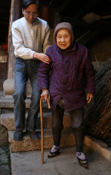 It's not that common with newer generations, but it was in the generation of this older lady. After her generation dies, you'll be hard pressed to find any women that still practice foot binding.