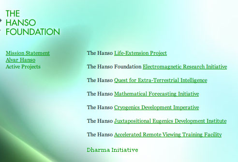 2. the hanso site: there is a 'secret' mouseover that highlights "the dharma initiative", although nothing happens when you click