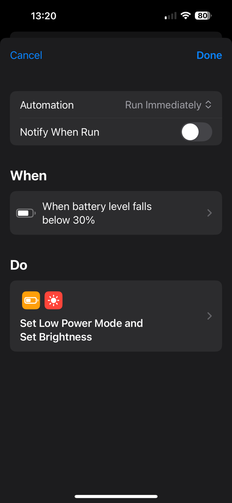 I use a simple automation to turn on Low Power mode when it hits 30% battery, you can just change it to 20%….Damn, how bad is this? 😂