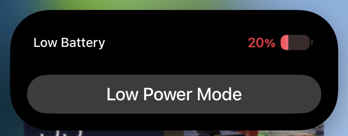 On my 14 Pro, this is what happens when my battery reaches 20%. The notification (prompt) shows up in the Dynamic Island. Long pressing on it brings up a pop up to turn on low power mode.14 pro always prompted me