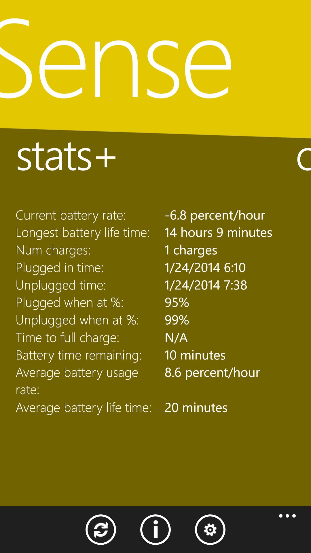 This is my first full run in of my 1520 after a couple of days of charging. I found this battery app that gives comparable stat info to Android and downloaded it this morning before starting a full day of use. So, I downloaded the app, topped up the charge and started my day of no charger at 7:38am.