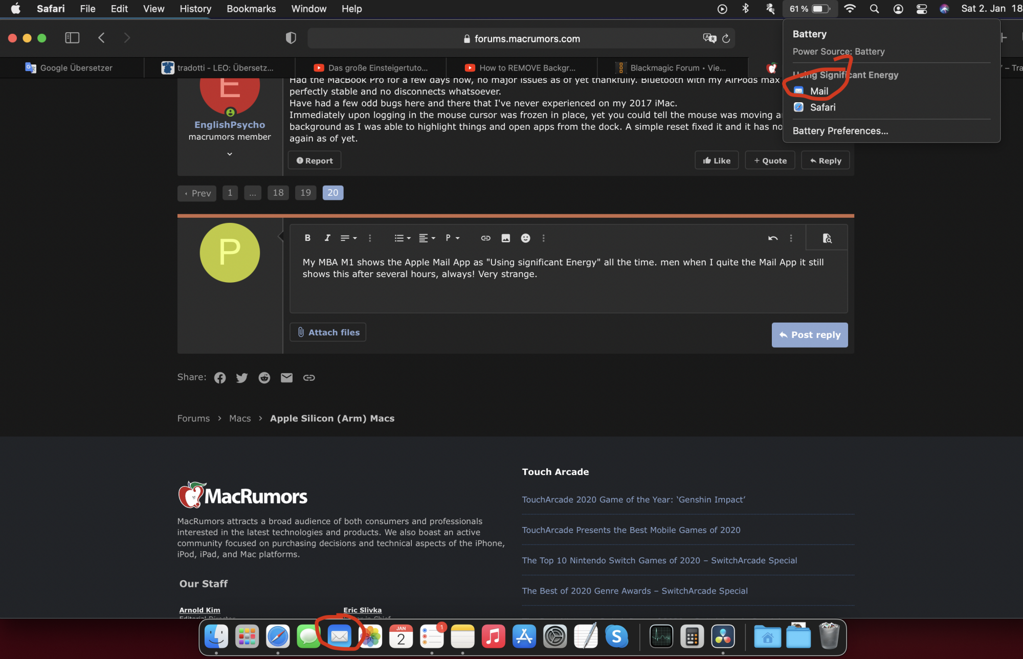 Does Activity Monitor show anything suspicious for CPU, memory or energy use?My MBA M1 shows the Apple Mail App as "Using significant Energy" all the time. men when I quite the Mail App it still shows this after several hours, always! Very strange.