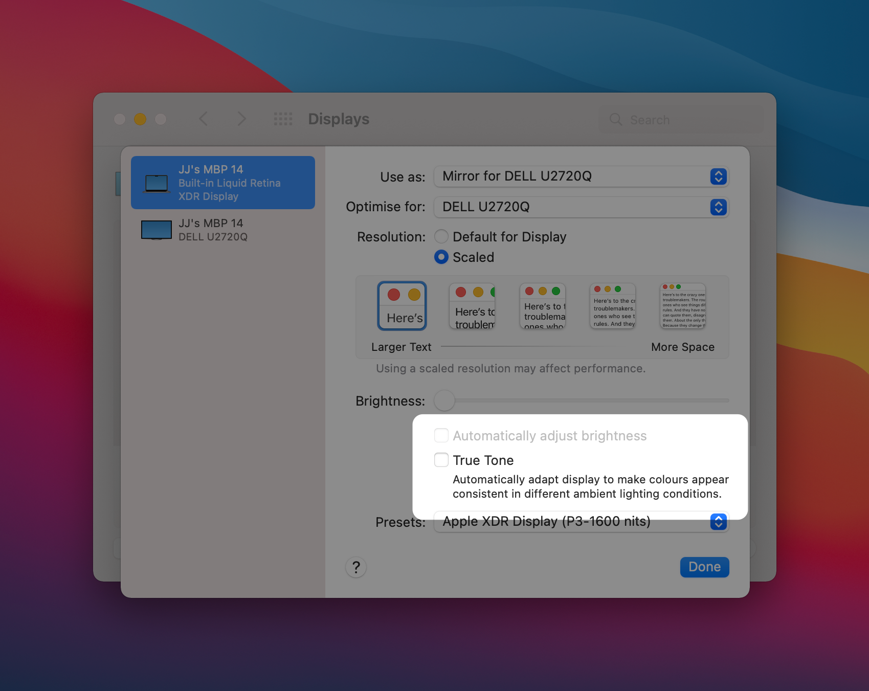 (I mostly run this with the MBP lid closed, so the Dell monitor is the only active display)