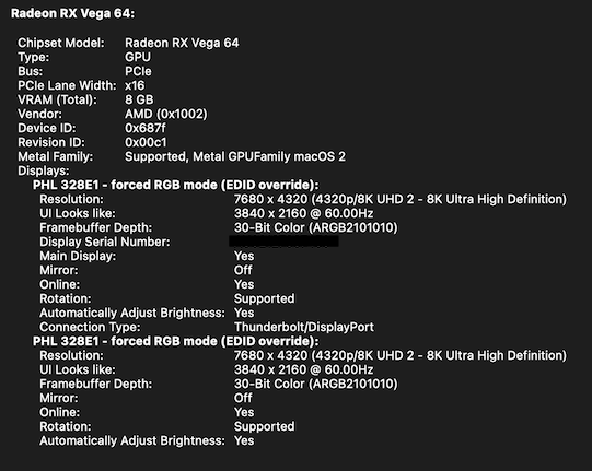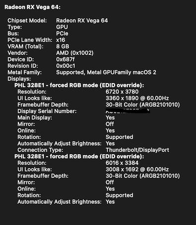 - On the Hackintosh, the serial number for the display shows up in System Information for the DisplayPort connected monitor, but not the HDMI one. On the M1 it does not show a serial number (connected via HDMI)