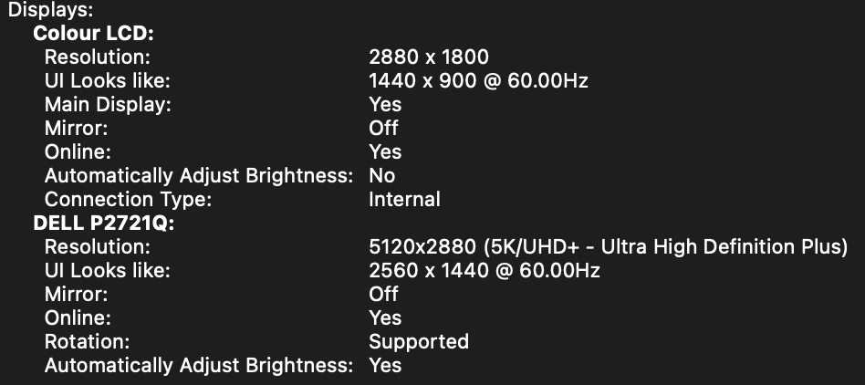 U2720Q is good if you can get it on discount, unfortunately no chance where I am. I don't have a Windows machine to test right now but I believe Windows should have less issues (I think Sarpanch has confirmed above). Apple still "thinks" it is doing 2x scaling, in the system it treats the monitor as a 5k panel for a 1440p retina/hidpi output. See below:I considered too P2721Q but I think I want P3 monitor so probably end up getting U2720Q. I checked price history and saw it has been sold few times close to the price what that other model is currently, so hopefully that happens again soon.