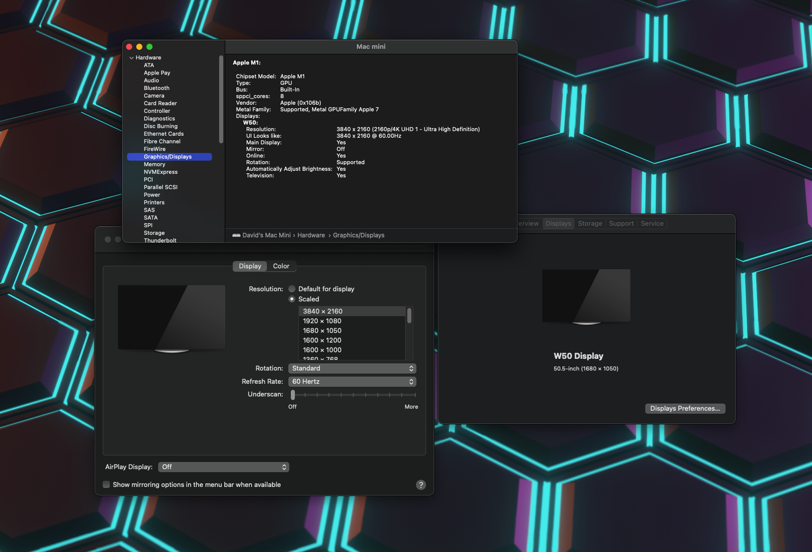 I use a 50" 4k UHD TV as the display for my mac mini. I had my late-2014 mac mini connected to it which displayed at 1080p 60hz as the default, but I could set it to 3840x2160 with no difference in scaling and looked beautiful (granted it only ran at 30hz with a bit of lag, but no problems with UI resizing). I just received my new M1 mac mini today, and ran into a hugely annoying issue. For some reason the new mac reads the display default as 1680x1050 60hz, which looks horrendously bad, and if I change it to the 4k resolution at 60hz everything looks nice and sharp but all windows/icons are resized to be extremely small. I really don't want to have to go with the 1080 again, it's not bad but I was really looking forward to using 4k here. I am using the same HDMI cable I was using with the 2014 mac mini, plugged into the same port on my TV. Does anyone know of a potential fix for this issue? Thanks!