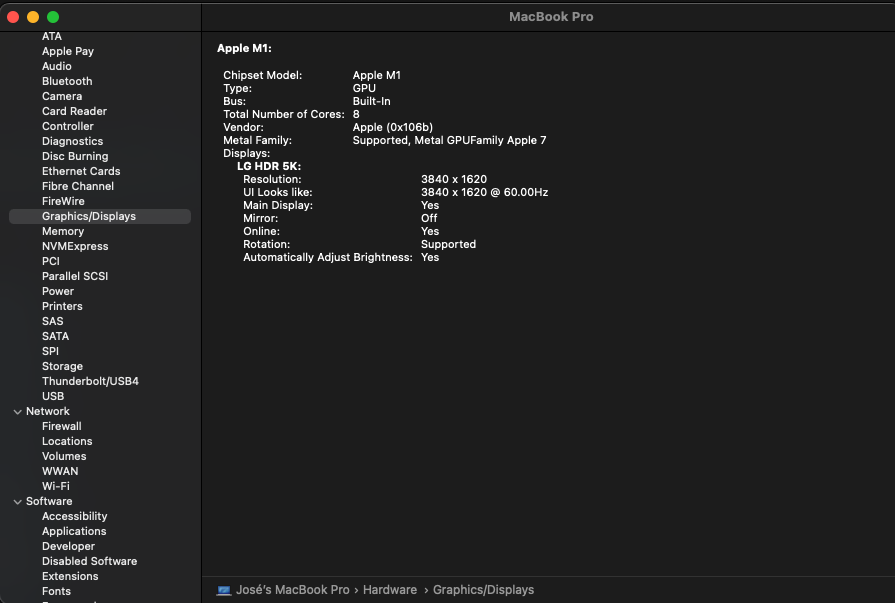 @Marco.como When you are next able while running at 3840x1620 are you able to take a screenshot of the System Report under Graphics/Displays. You do this by click on the top left hand Apple icon on the MacOS interface, then clicking System Report within the Overview tab and then choosing Graphics Displays on the left-hand menu. I have attached mine as an example.
