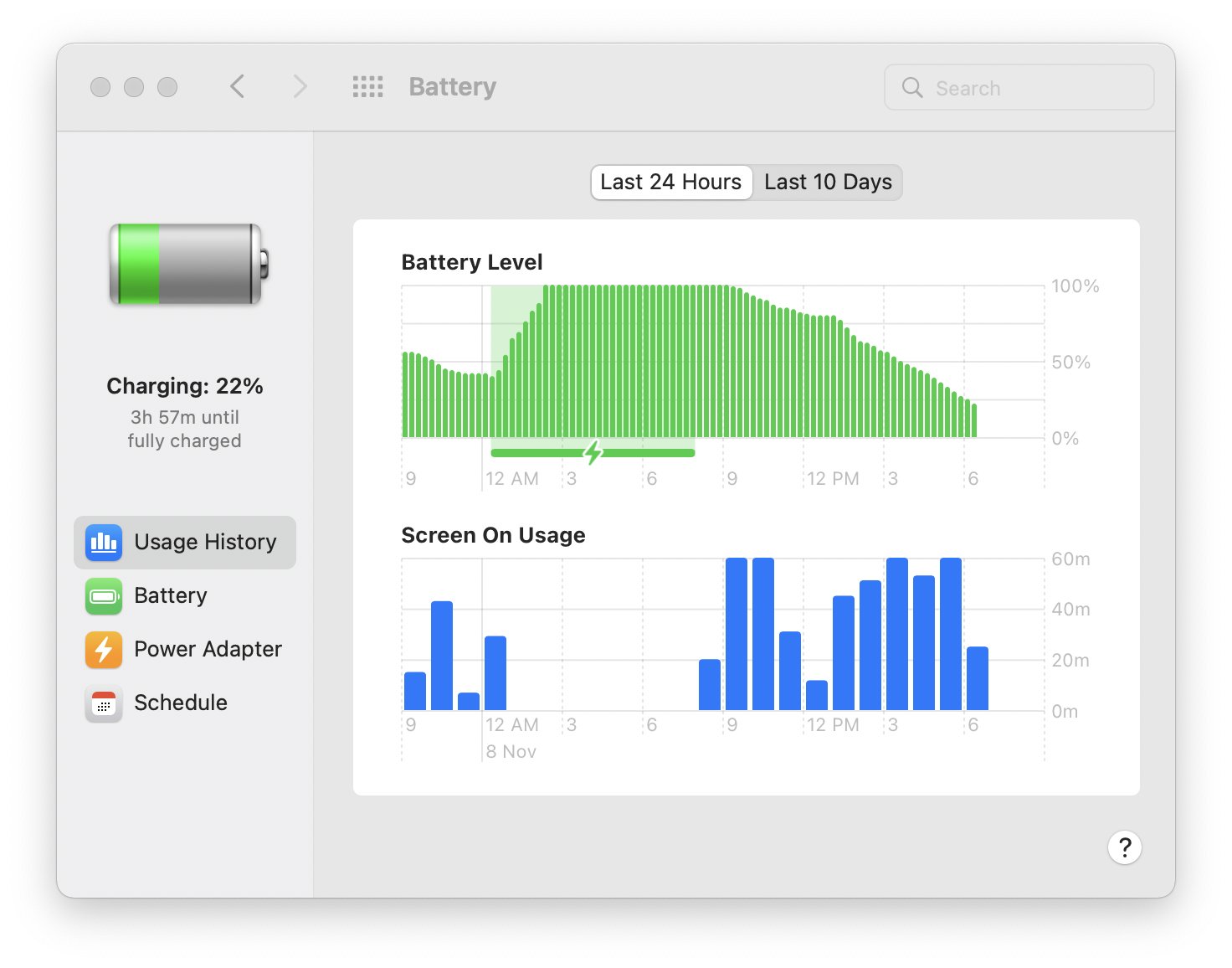 Today was the first full workday I used the 14" M1 Max on battery. Went from 8:30am unplugged to 6:30pm plugged in, with just over eight hours of screen-on time. The power profile was Automatic (not on Low Power Mode). Apps I used: