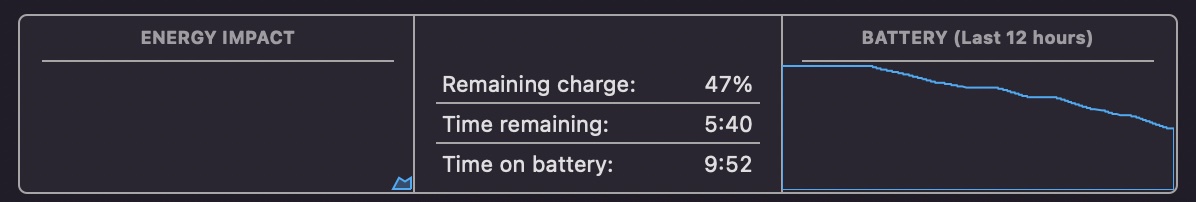 Looking at the chart, you can probably tell when I started to use Zoom; it makes a dent! Overall, I will say it's pretty solid. It will be interesting to see how external monitor usage affects battery life.