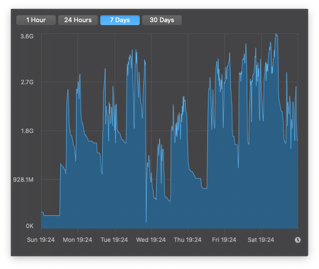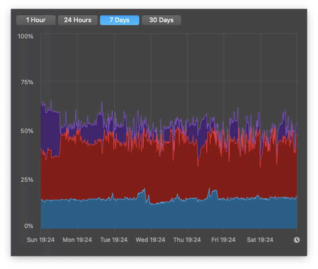 The M1 mini is running a server with both high IOPS and high bandwidth tasks, acts as a maths cruncher, transcoder, data ingress device, UniFi Controller, Plex Server and a brace of other things. CPU load spends quite a lot of its time at around 40% with spikes to 100% when workload is particularly high. Yes, this M1 does get to beachball. Even averaged over 7 days the CPU workload is clear: