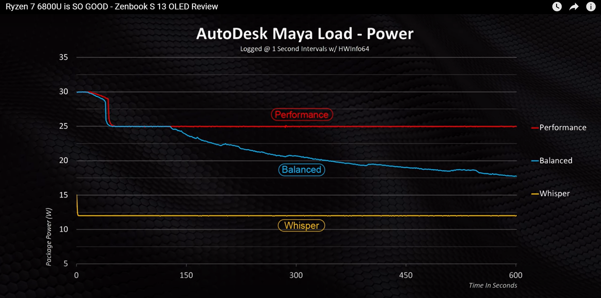 It’s because it throttles instantly. At peak power (peak possible clock) that CPU would consume over 60-80W which is why the PL2 limit kicks in after few milliseconds. Also, your graph doesn’t show the performance. We know from other examples that between 30W and 10W TDP the 6800U suffers around 30% reduction in performance. Now imagine if it could sustain its peak 80W.