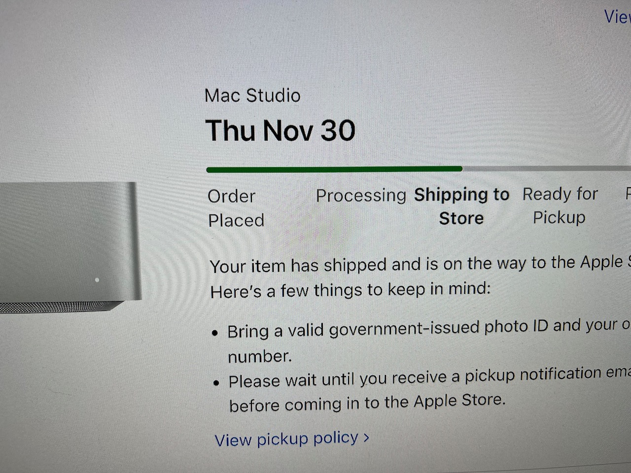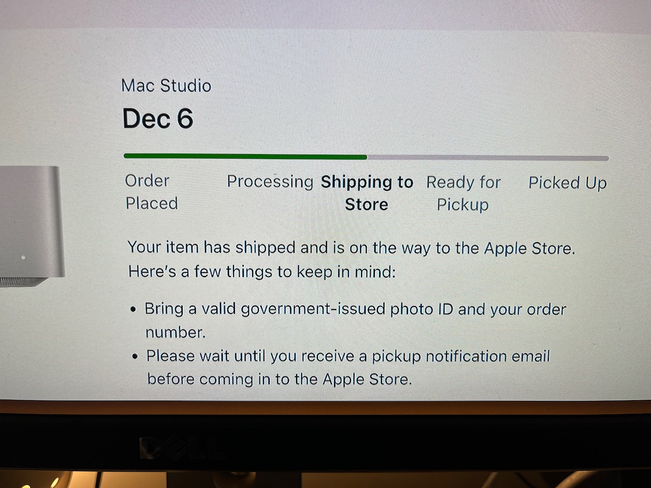 I ordered a new Mac Studio (M2 Max, 12/30/16, 64GB memory, 2TB storage), along with Studio Display (tilt- and height-adjustable, standard glass), on 11/12. Also a new keyboard and mouse (black). Received the display, keyboard and mouse on 11/15, and the computer shipped from China on 11/17 and will be delivered by FedEx today.