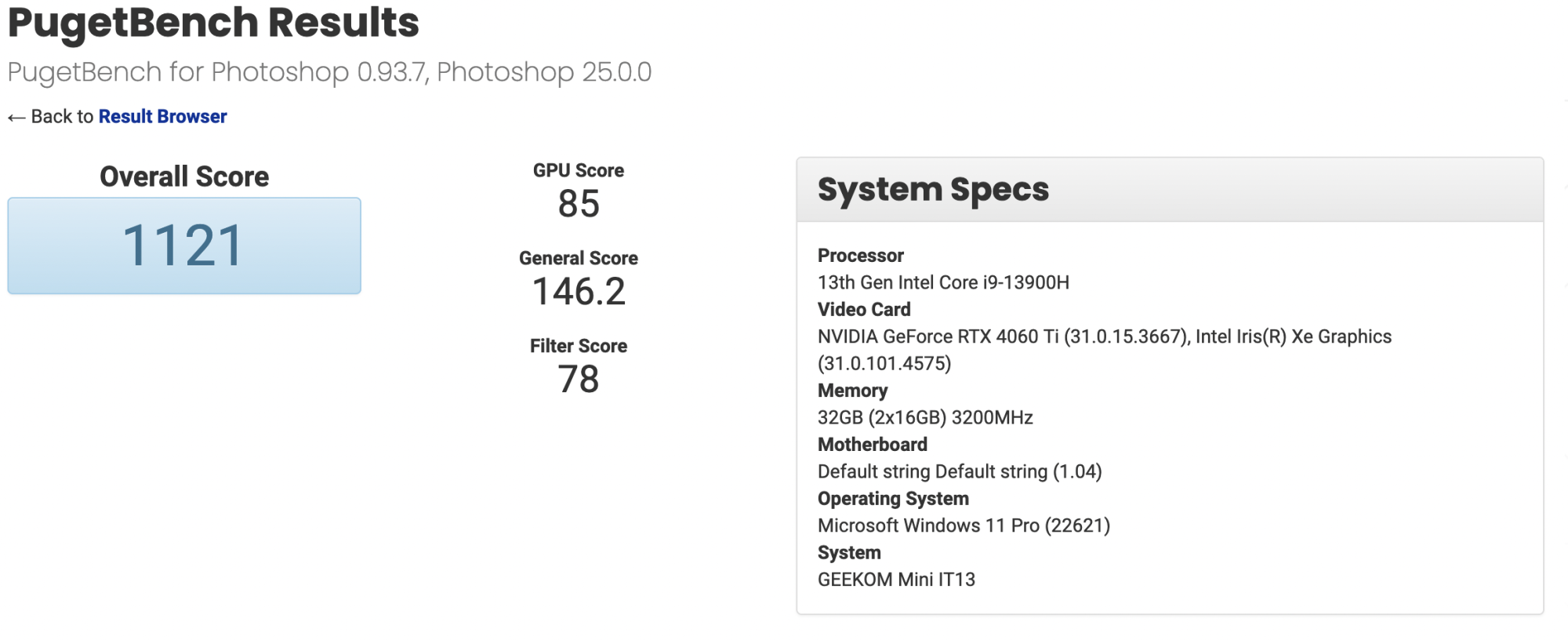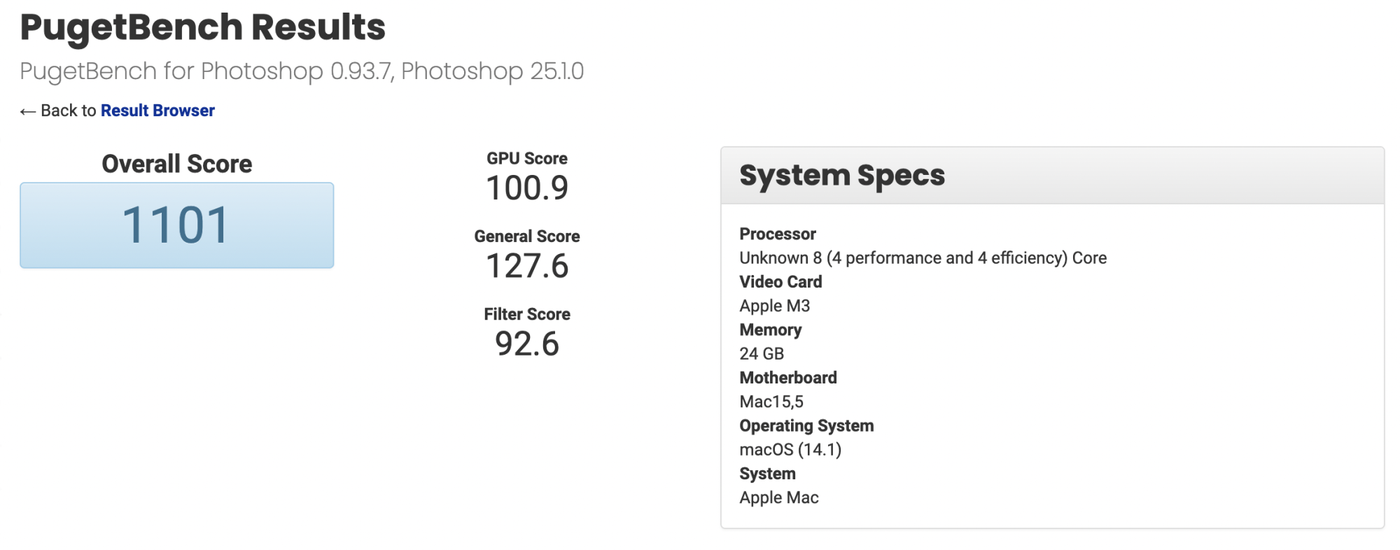 I’m not very familiar with that benchmark, but that looks pretty impressive.Some results for Pugetbench Photoshop for base M3. I know there are higher scores for similar PC systems but it's funny to see a small M3 laptop perform as good as powerful PC laptops or desktops. Take a look at the GPU scores.