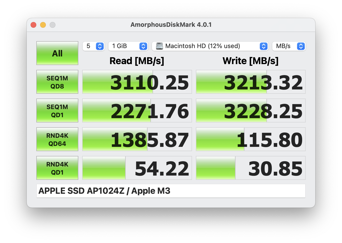 This guy on YouTube got these read and write scores on the base iMac M3 with 256 gb ssd.