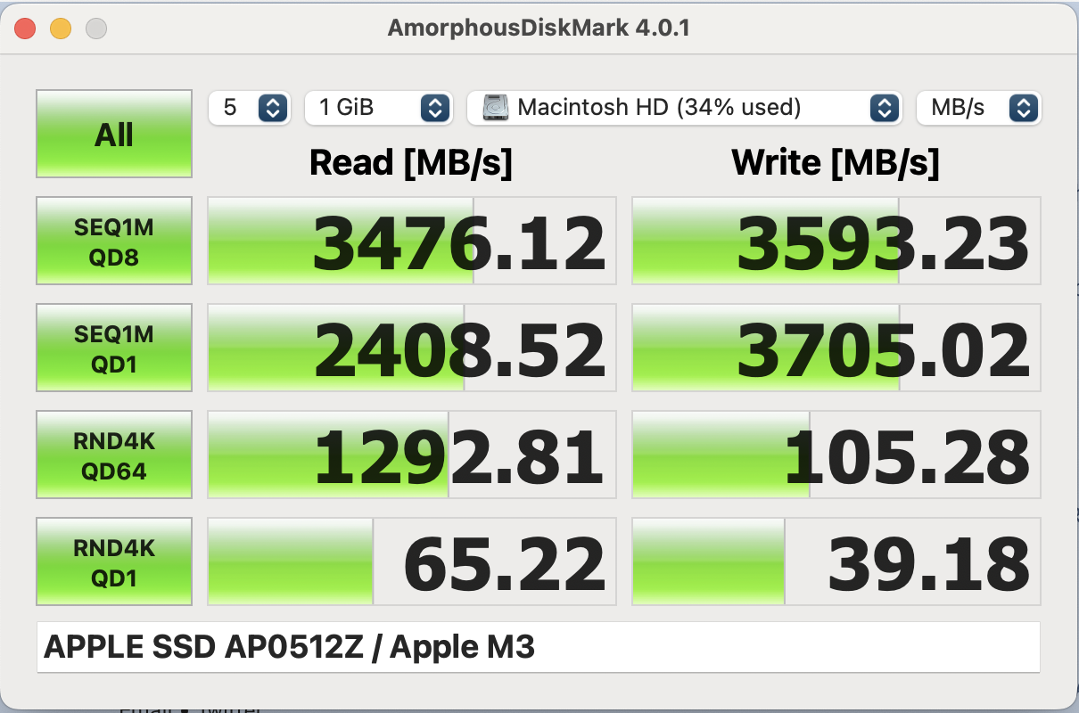 Kindly let's do the tests with the same software, we use this one which is free https://apps.apple.com/us/app/amorphousdiskmark/id1168254295?mt=12M1 pro 1024 gb : ( its faster than my mac pro ...)