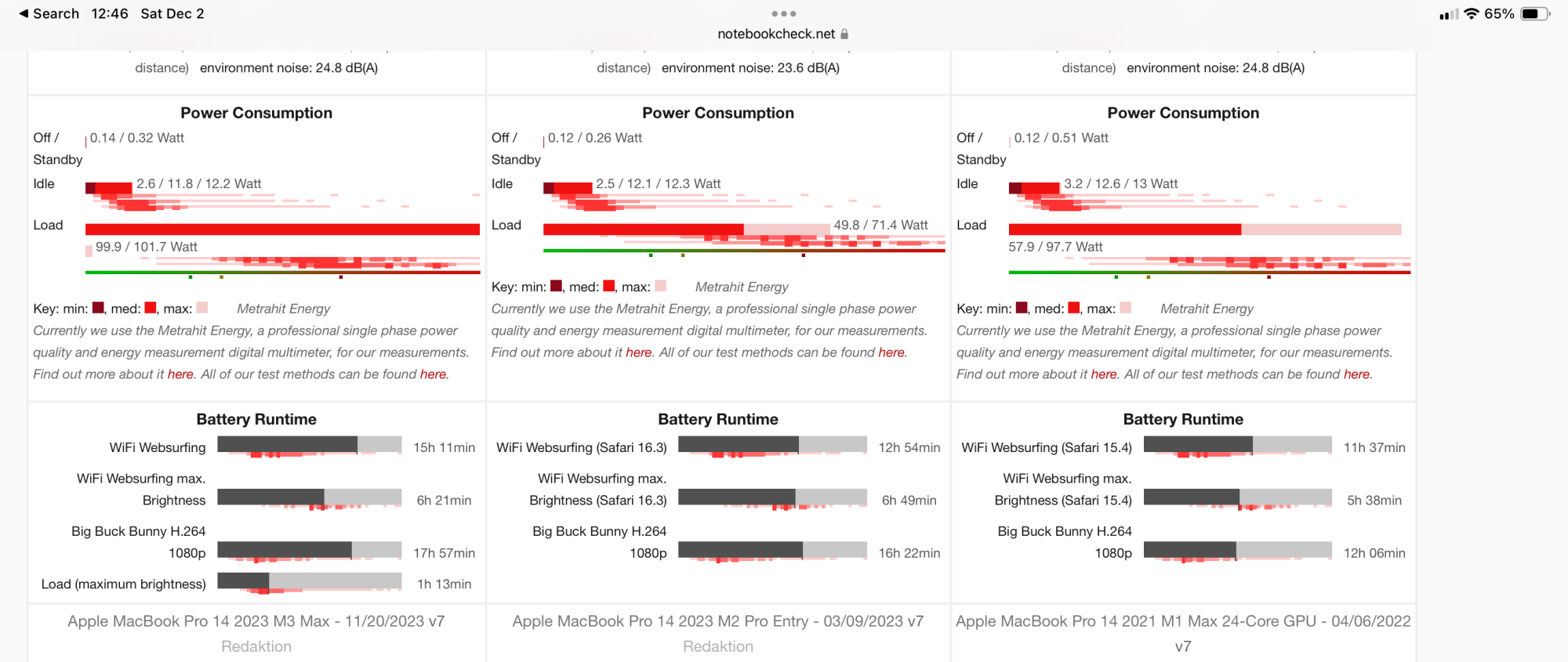 These are actual facts... users here just want to whine.In Notebookcheck.net tests, the 14” M3 Max (40 core GPU config) has longer run times on playing a h.264 video and on their web surfing test than both the 14” M1 Max (no surprise) and 14” M2 Pro entry level (surprised me). I don’t think that they did these tests using low power mode. So, M3 Max chip does pretty well in terms of battery run time.