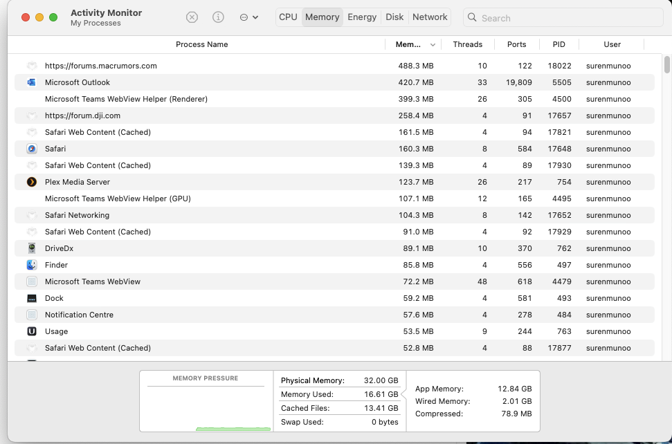 Now, going back to the M3 Max machine, if simply looking at memory used is incorrect because we expect to change as more apps are used, then what metric can I use besides the color coded memory pressure?
