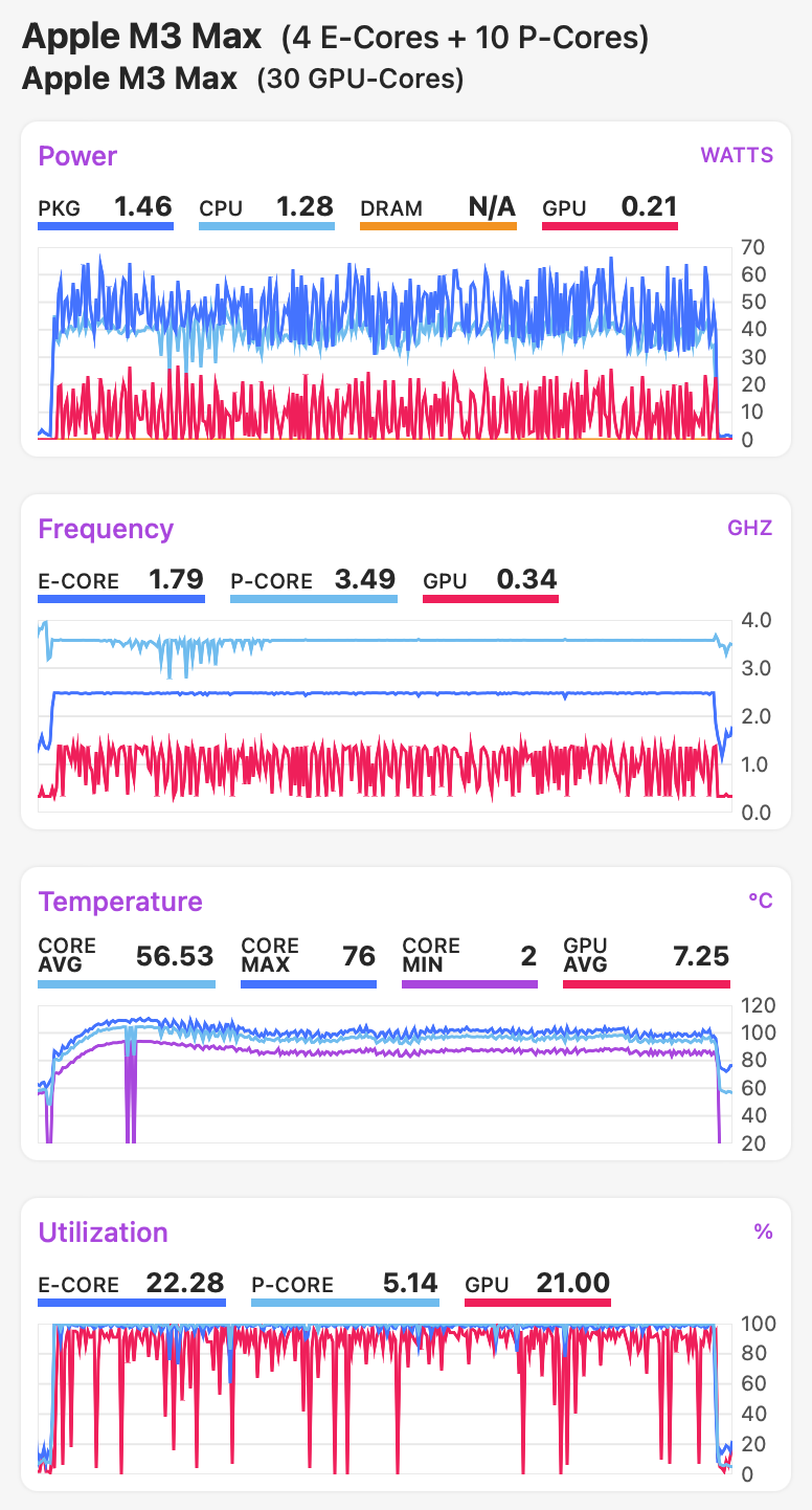 Lastly, briefly going back to the M1 Max, I do see similar behavior, but not as severe as this (need to run some more tests on that machine though, I've been focused mainly on the M3).