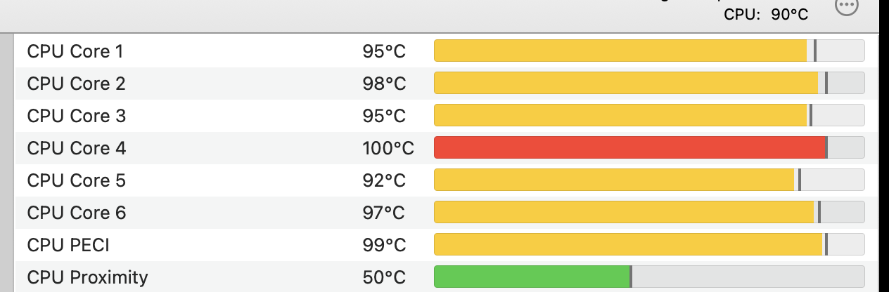 I've noticed that CPU cores 4 and 6 are always hotter. Core 6 quickly peaks at 100C when doing intense tasks, and I assume makes the CPU clock down. I use iStat Menus to monitor temps, but it doesn't show clock rates.