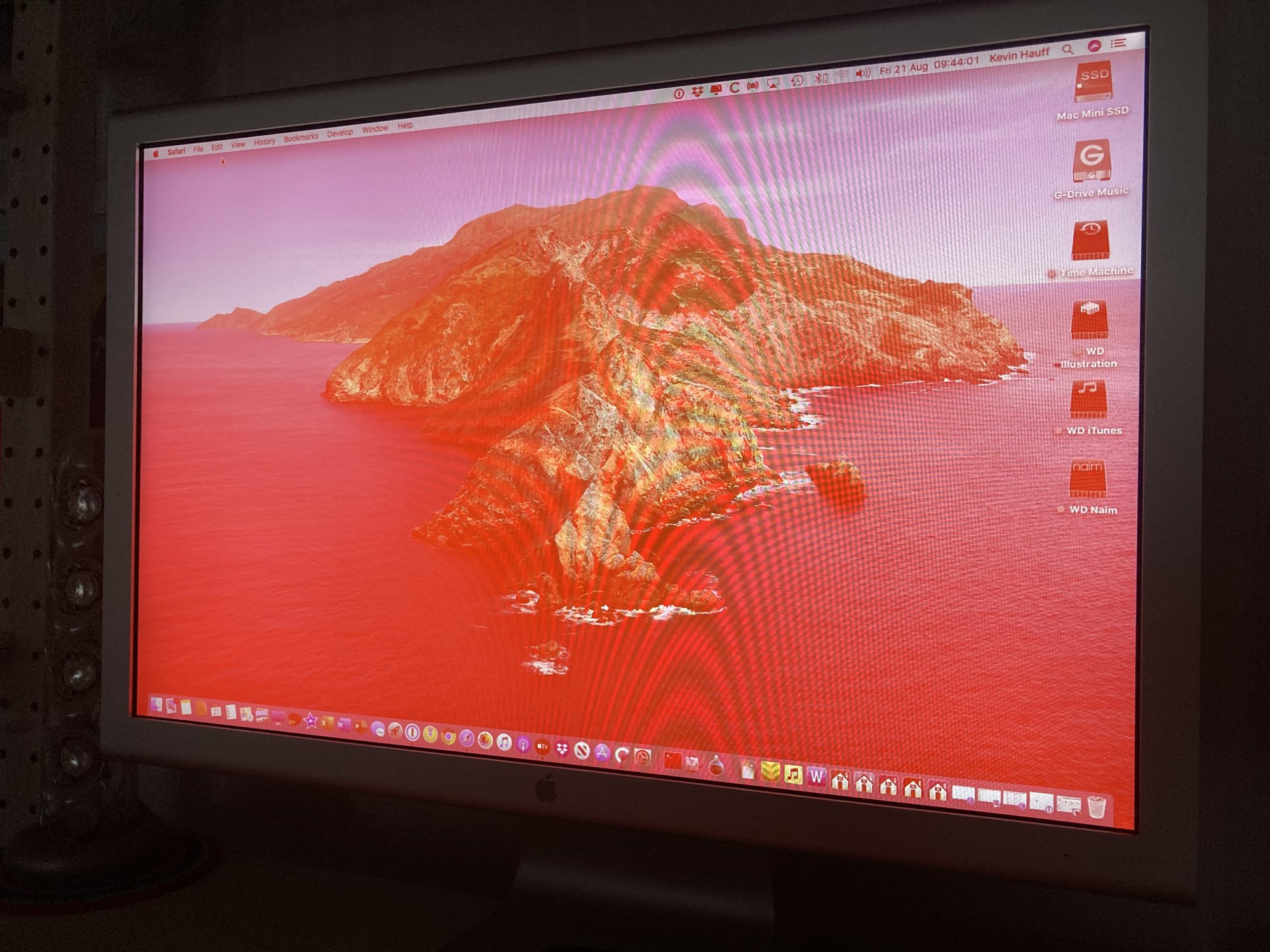 Has anyone experienced this problem before (photo attached)? My Mac Mini / Apple 20” Cinema Display screen suddenly turned red with no warning! But If I take a screen shot and save it to photos, and view my photos on an iPad, the screen shot appears fine in tonal balance?