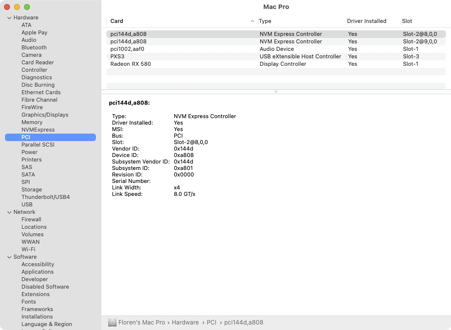 OWC Accelsior S SATA-3 PCIe 2.0 card. It's a SATA SSD, not NVMe, or AHCI - slot 4.What card do you use, Syba? I believe the card model and slot are important.