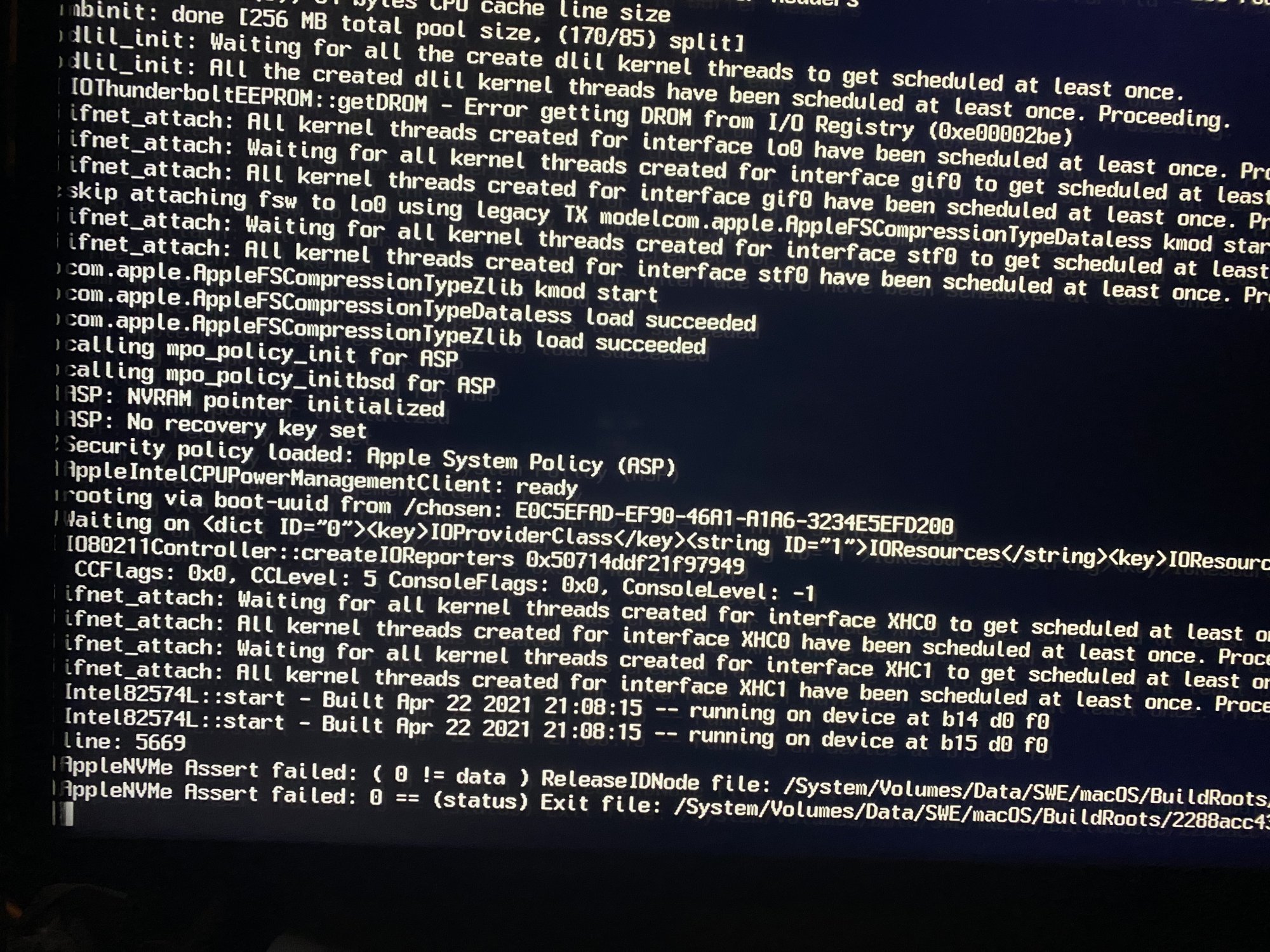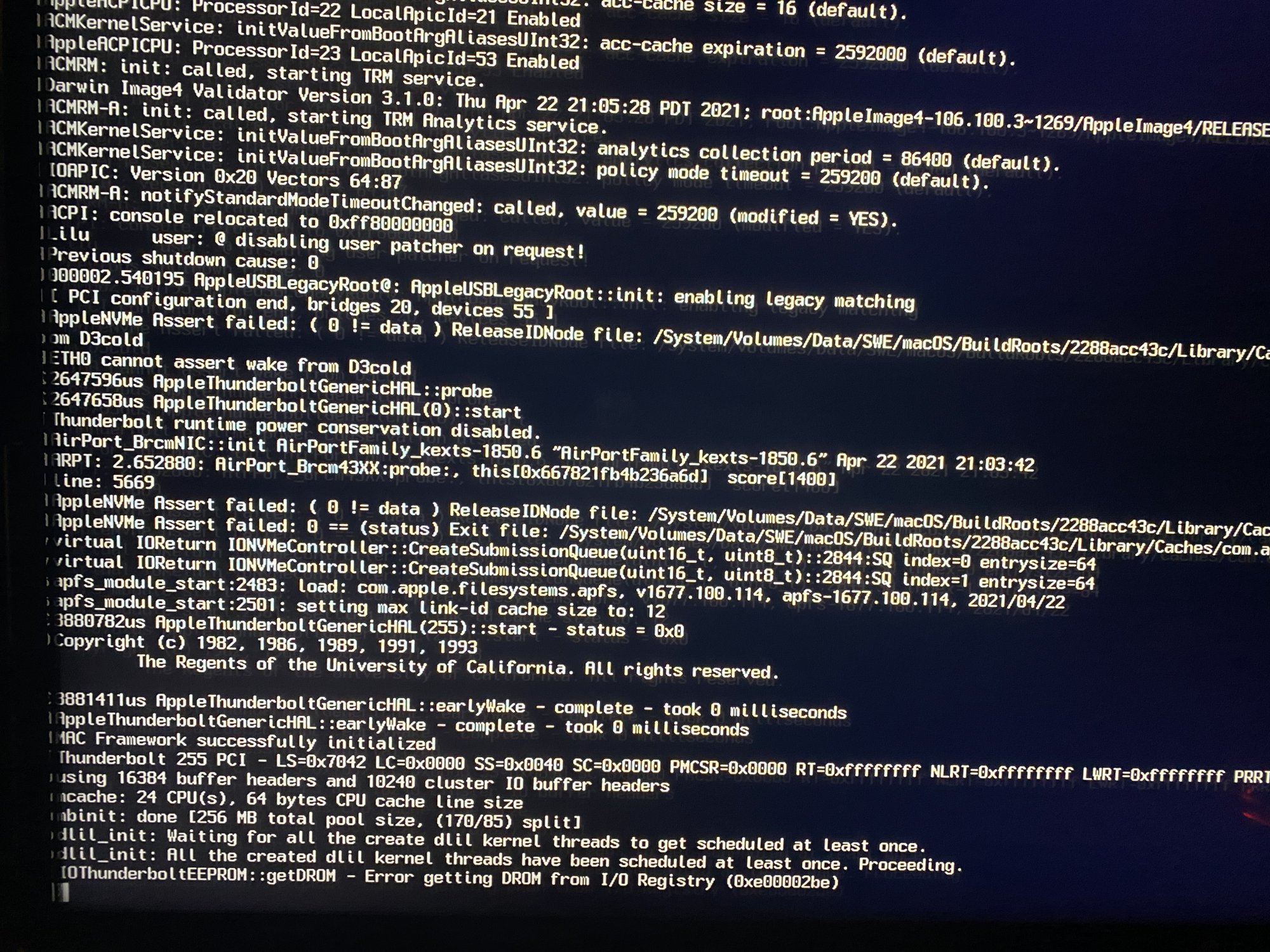There is something about this. It seems that on a failed boot, the system loses access to storage devices early in the rooting phase. This occurs even before we see the hang in verbose mode. To test this hypothesis, I booted macOS on a supported Mac from a USB drive, and unplugged the drive at around #[EB|LOG:EXITBS:START]. This provoked a hang later in the process similar to what we have been observing. Of course, this is on a different machine, so the hanging doesn't occur at the usual ethernet initialization point. It would be interesting to repeat the experiment on a Mac Pro 5,1.One thing is if you watch the status lights on NVMe drive, it will blink right away rapidly when its booting correctly, if it doesn't start rapidly blinking then just unplug an plug it back in, don't wait on a slow loading bar, its not doing anything if the status lights aren't blinking...